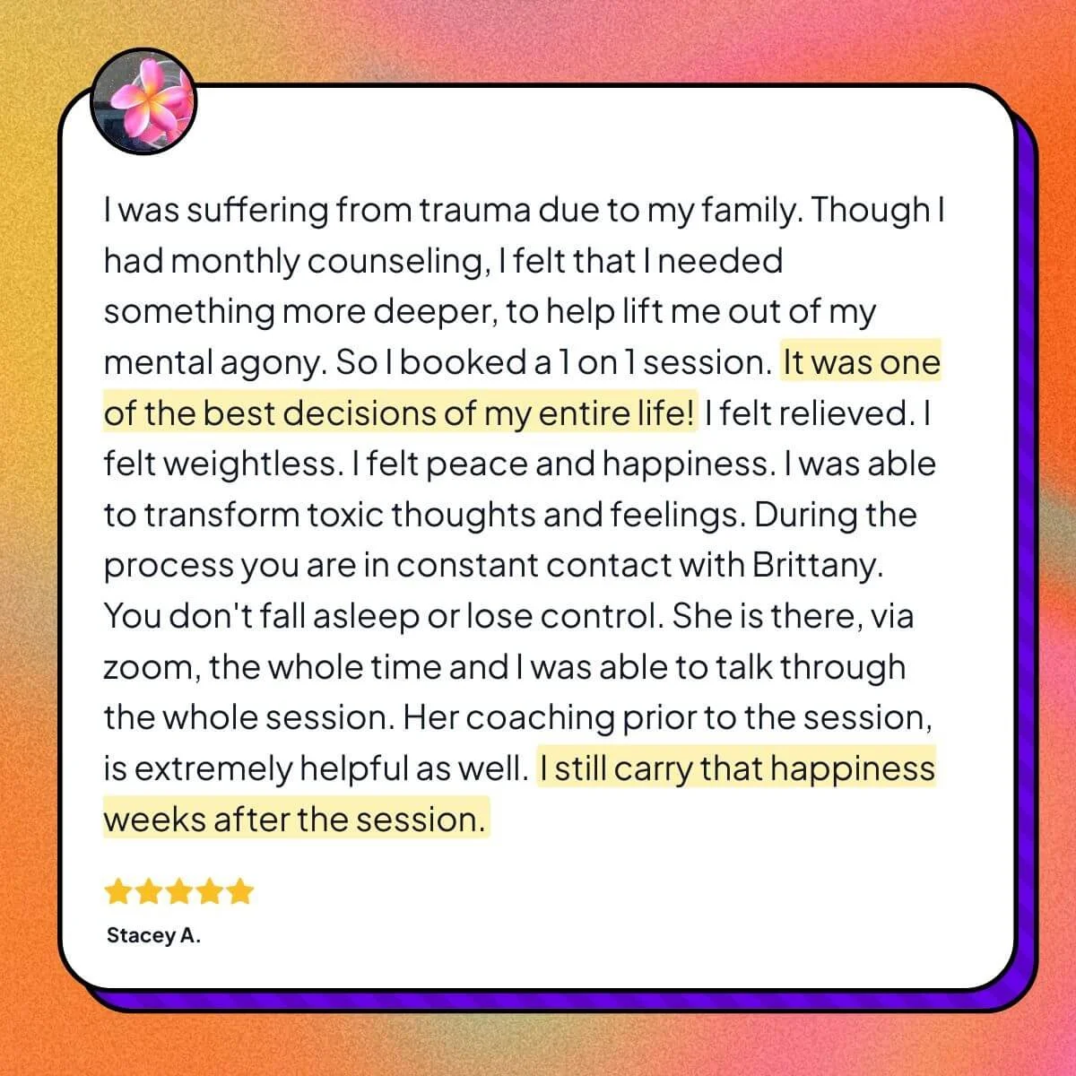 ββ¦Because of that session, I was able to pivot my business model, and not only create space to grow my business and experiment in a way that I had never done before, but it also opened me up to this idea and possibility that I could write my own book one day. And after our session, I started to write my first personal memoir, on top of growing my copywriting, ghost writing & marketing businessβ¦Without Brittanyβs help in this area and helping me clear these subconscious blocks that we're coming up - through the power of hypnosis and through Brittanyβs gift - this would not be possible! There is no one better to walk with you through this journey.β