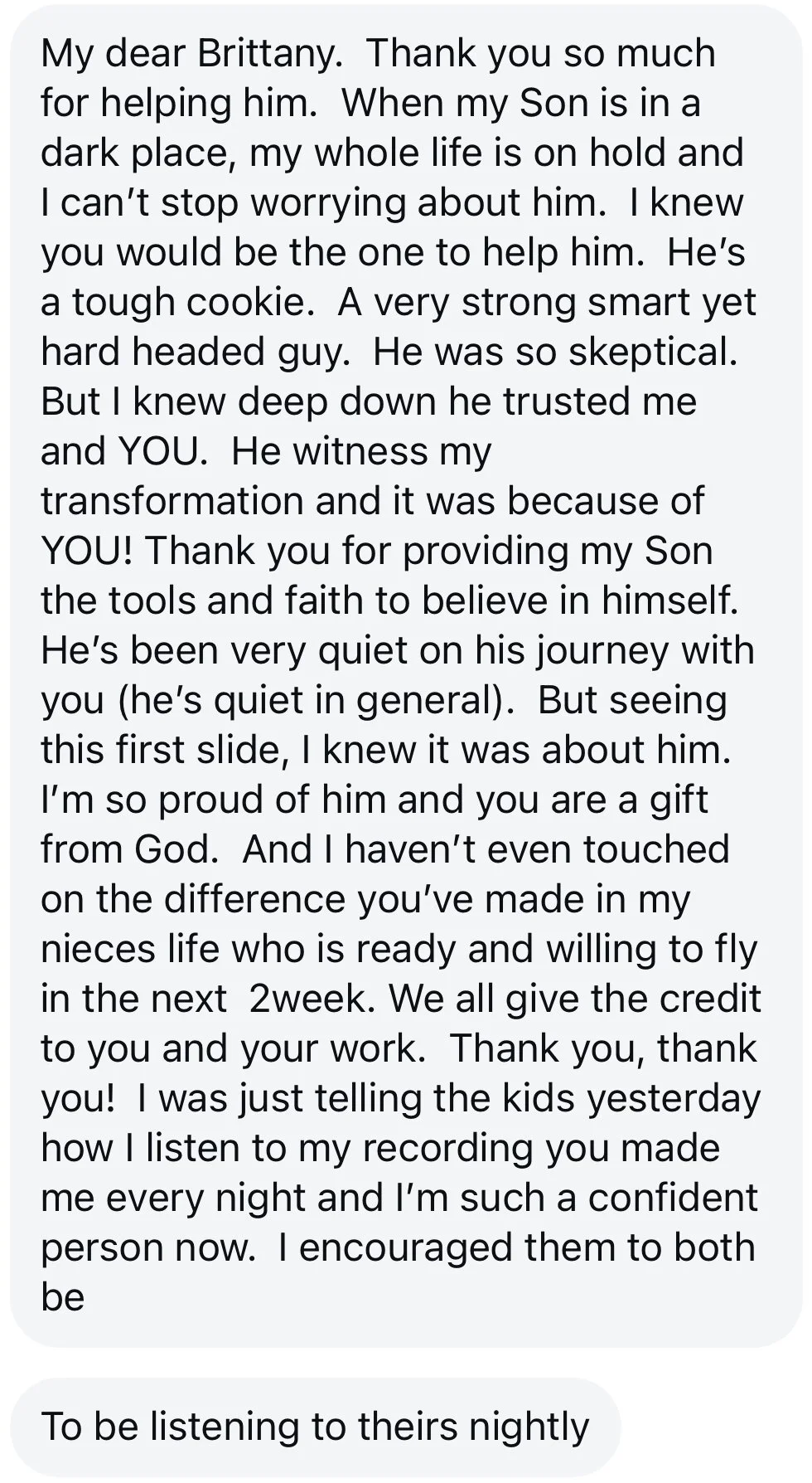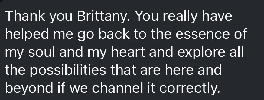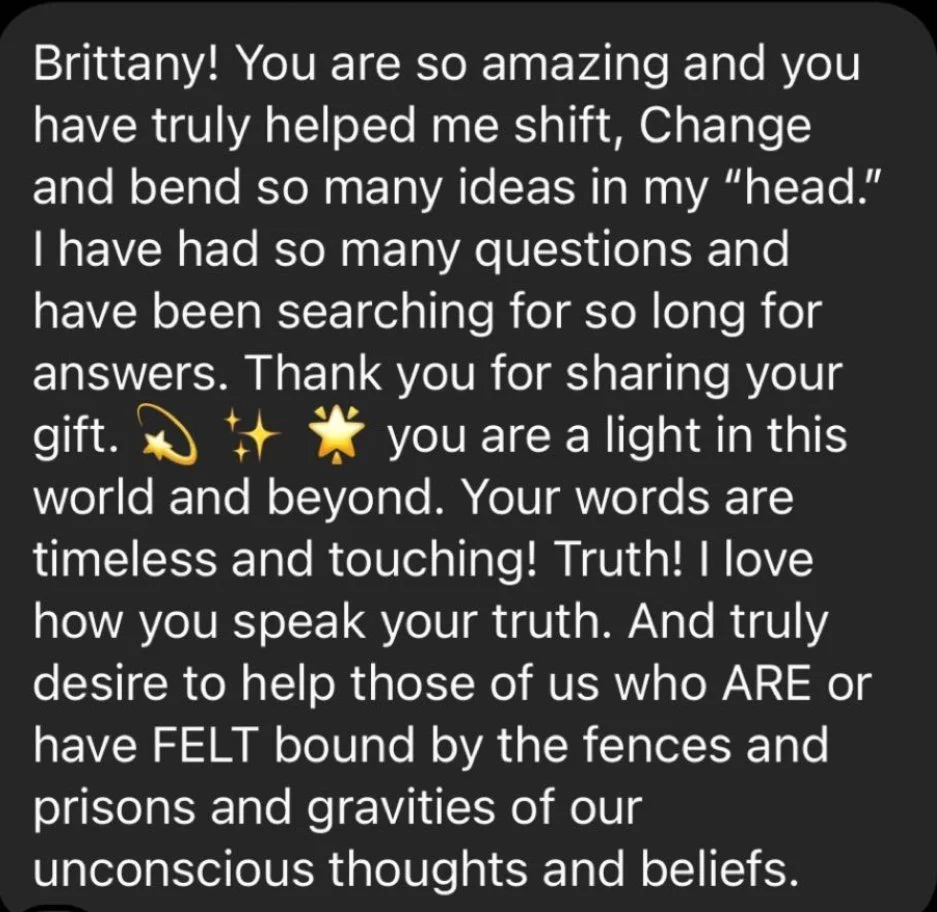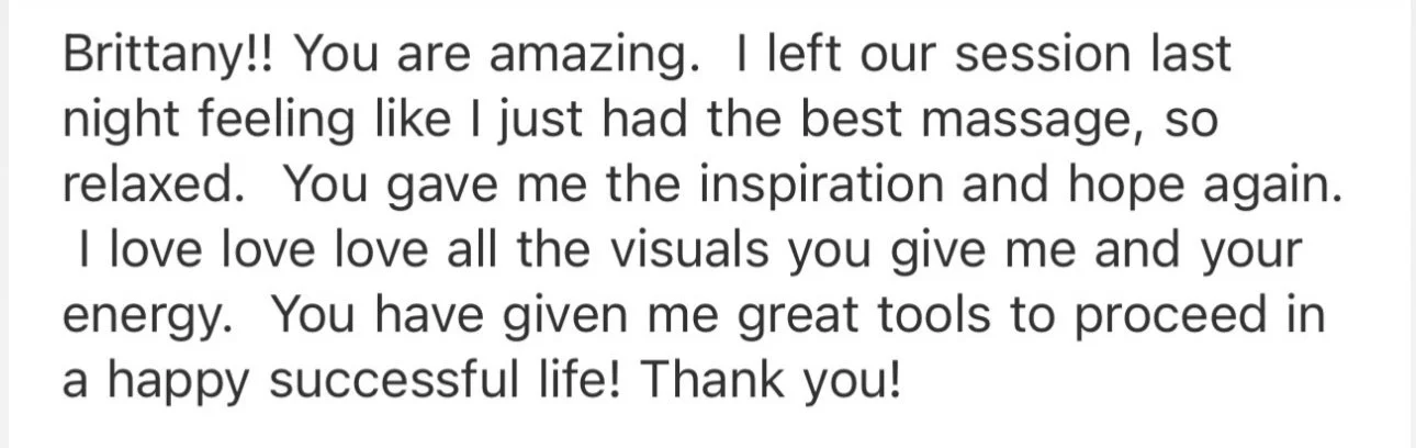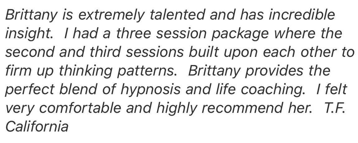 “…Because of that session, I was able to pivot my business model, and not only create space to grow my business and experiment in a way that I had never done before, but it also opened me up to this idea and possibility that I could write my own book one day. And after our session, I started to write my first personal memoir, on top of growing my copywriting, ghost writing & marketing business…Without Brittany’s help in this area and helping me clear these subconscious blocks that we're coming up - through the power of hypnosis and through Brittany’s gift - this would not be possible! There is no one better to walk with you through this journey.”