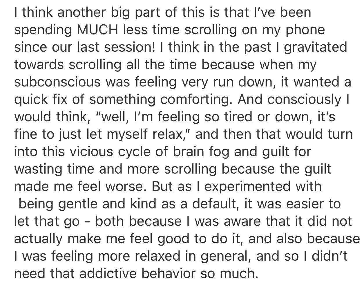 “My experience has been awesome. She's been an empathetic, compassionate and whip-smart guide through the process. Results have been great! I have been able to challenge some of my self-defeating thought patterns, get to the root of my imposter syndrome, understand what is rational vs. irrational worry with a little bit more clarity.”