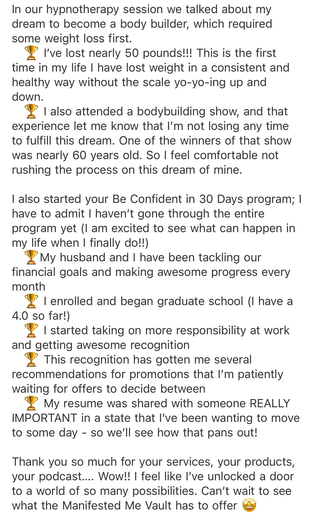READ THE INSPIRING WORDS OF CLIENTS WHO’VE SHIFTED THEIR SUBCONSCIOUS MINDS, STEPPED INTO THEIR MANIFESTED SELVES, AND CREATED EXTRAORDINARY RESULTS…